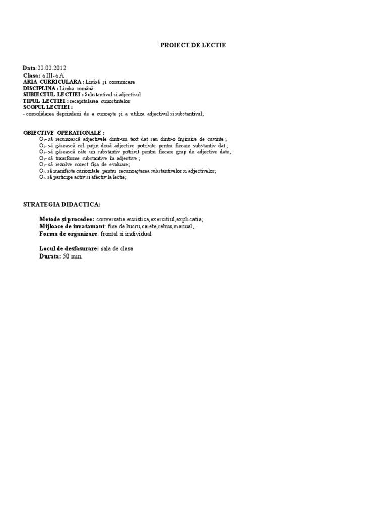 Aria Curriculara Limbă Si Comunicare Disciplina Limba Romană Subiectul Lectiei Substantivul Si Adjectivul Tipul Lectiei Recapitularea Cunostintelor Scopul Lectiei
