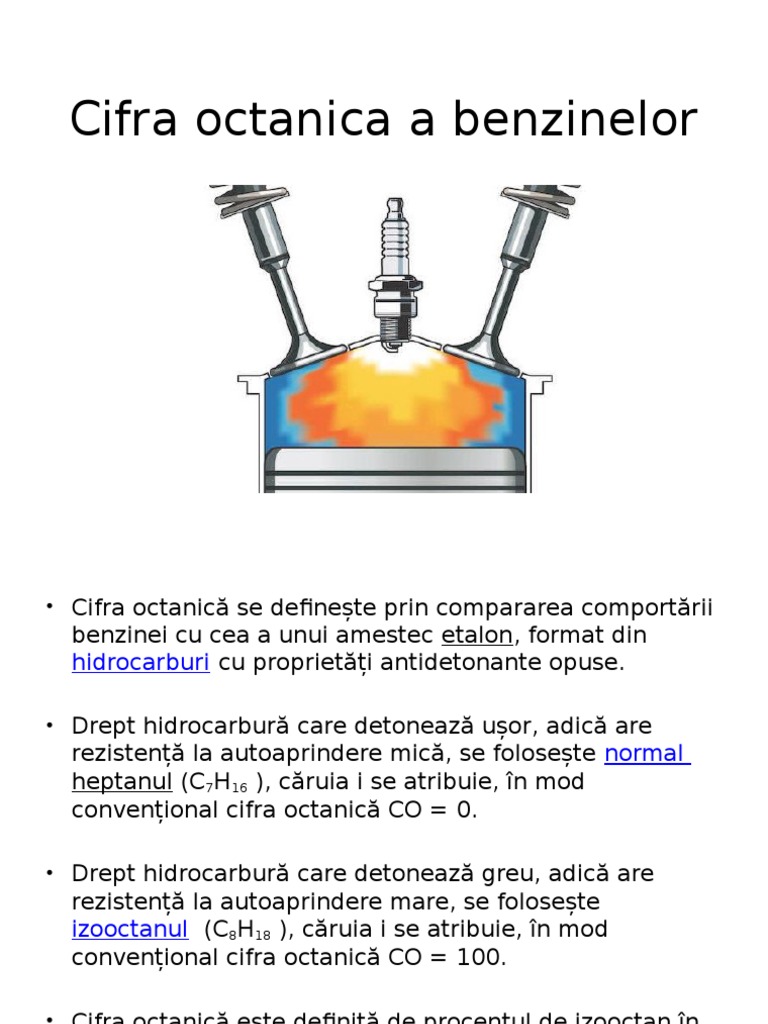 Atunci inseamna ca tu susti ca ce spune chimia este fals normal ce scrie in articolul asta ar trebui sa fie adevarat in rest aia este problema ta ca nu vezi diferenta prin definitie cum scrie si in articolul acesta cifra octanica prescurtata co este procentul de izooctan si n heptan din benzina totodata se spune ca cu cat cifra octanica este mai mare cu atat benzina are calitate mai buna. Cu cât cifra octanică este mai mare cu atât motorul are un randament mai bun în parametri optimi şi oferă un cuplu şi o putere mai mari decât dacă ar utiliza o benzină cu cifra octanică mai mică. Dacă în manualul mașinii nu se face nicio recomandare cu privire la cifra octanică a mașinii atunci o benzină cu cifră octanică mai mare nu va aduce niciun beneficiu decât în conturile companiilor petroliere. Ca analogie este ca atunci când celsius a stabilit că temperatura la care fierbe apa va avea nivelul 100 de grade pe scara sa.