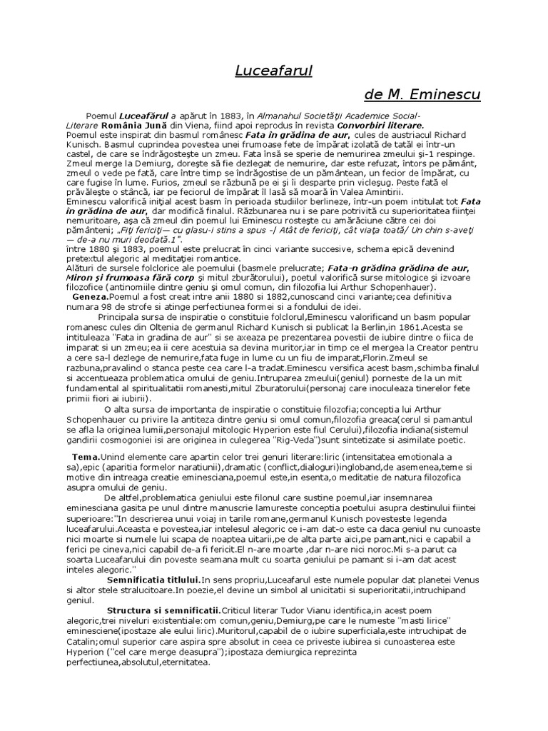Comentarii Bacalaureat Luceafărul De Mihai Eminescu Wattpad