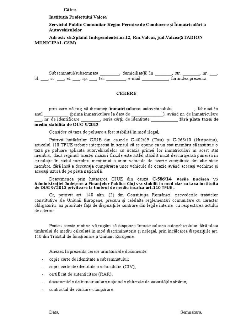 Model Cerere Inmatriculare Fara Plata Timbrului De Mediu